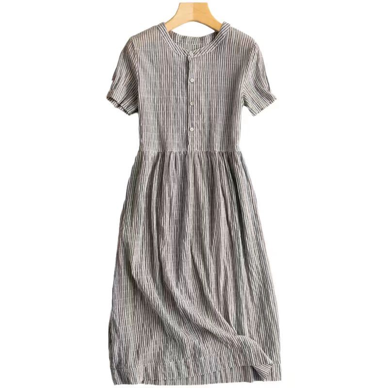 2026 Retro Striped Cotton Linen Dress, Women's Summer Short Sleeve Shirt Maxi Dress